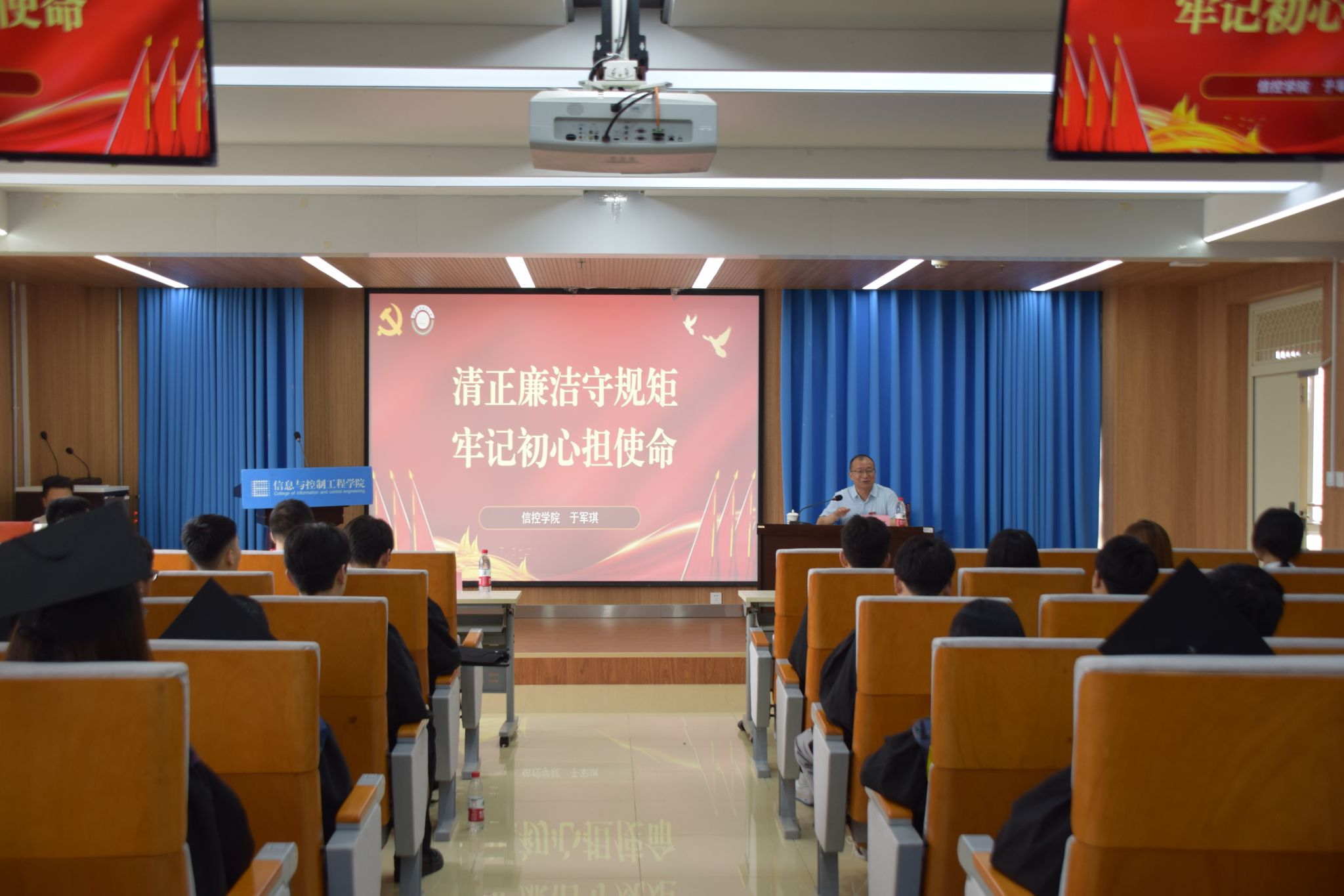 学院党委书记于军琪以“清正廉洁守规矩 牢记初心担使命”为题讲授党课。他带领全体党员回顾了百年党史中的廉洁文化建设,并从三个方面阐述了“守规矩,担使命”在新时代更具重要性和紧迫性,一要在学党纪中铸忠诚,旗帜鲜明讲政治,真正把党的纪律规矩特别是党的政治纪律、政治规矩转化为政治自觉、思想自觉、行动自觉;二要在学党纪中强筋骨,守牢初心敢担当,要牢牢的站稳人民的立场,践行党“为人民服务”的根本宗旨,锻炼勇于担当的政治品质;三要在学党纪中强信念,勇担使命善作为,充分认识科技自立自强是国家强盛之基、安全之要,自觉履行高水平科技自立自强的使命担当。于军琪希望全体毕业生党员把握青春韶华,牢记我校“自强、笃实、求源、创新”的校训,以时代之先锋,以清廉之表率,始终坚守共产党员的操守与品格,保持建大人的热情与担当,坚守初心,砥砺前行。
