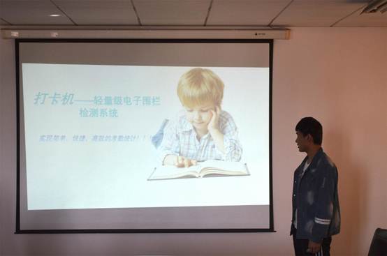张永虎同学通过PPT演示向评委老师们介绍了他们的作品《打卡机—轻量级电子围栏检测系统》,随后还进行了现场模拟打卡签到,董教授建议他们应调整应用市场,由个体签到面向企业签到方向发展。豆花视频