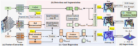 针对此问题,论文引入了视觉基础模型以提供像素级监督,并提出了挑战性的凝视物体分割任务。该任务旨在精确识别并提取出被人类凝视行为锁定的物体的像素级掩码,从而构建出语义清晰、边界明确的表征。论文设计了一个端到端的一体化凝视物体检测与分割框架,该框架不依赖额外的头部输入,能够并行地处理凝视估计、目标检测及实例分割三大任务。此外,论文还提出一种空间到物体的凝视回归方法来增强检测分支和凝视分支之间的交互,逐步提升人—物凝视关系的建模,从而实现清晰的凝视定位。在GOO-Synth和GOO-Real数据集上的大量实验证明了提出方法的有效性。