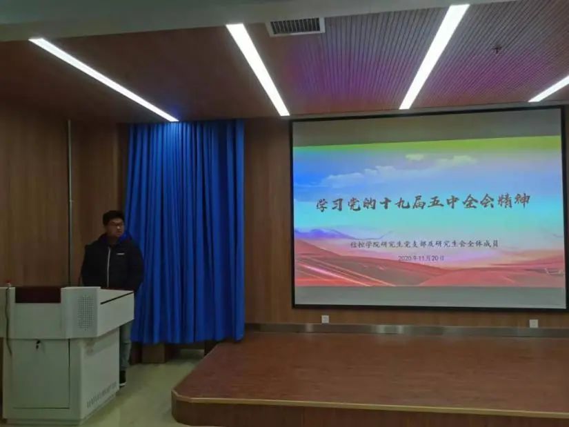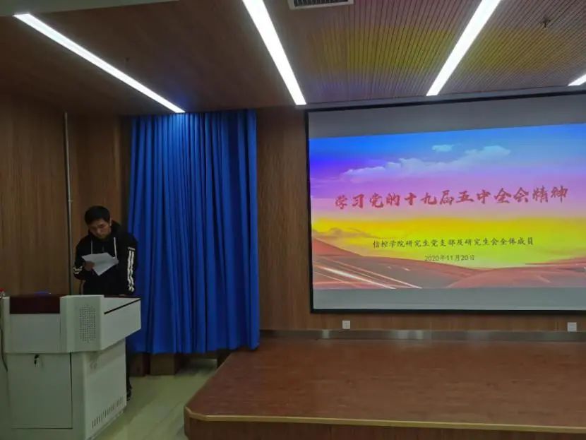 研究生第六党支部宋明轩同学主持。活动伊始,参会成员观看了《中国共产党十九届中央委员会第五次全体会议公报》(以下简称《公报》),学习了习近平总书记在全会上的重要讲话。总书记在会上深入分析了我国面临的国际国内形势,提出了一系列的新思想新论断新要求,为我国未来发展指明了前进方向。此次讲话更加坚定了我们青年一代的理想信念,就是要把自己的命运与国家和民族的命运紧密联系在一起,努力为实现中华民族伟大复兴的中国梦贡献力量。