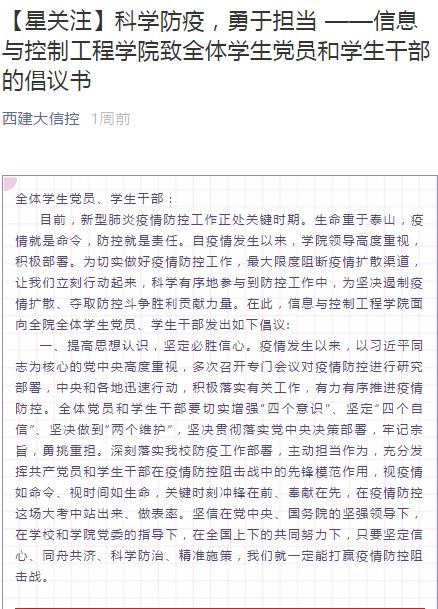 立即向全体学生党员和学生干部发出倡议书,组织发动年轻力量,科学有序地参与到防控工作中来。学生党员以身作则带头响应学院号召,遵守各项规定,发挥模范作用。2月6日,根据文件《豆花视频