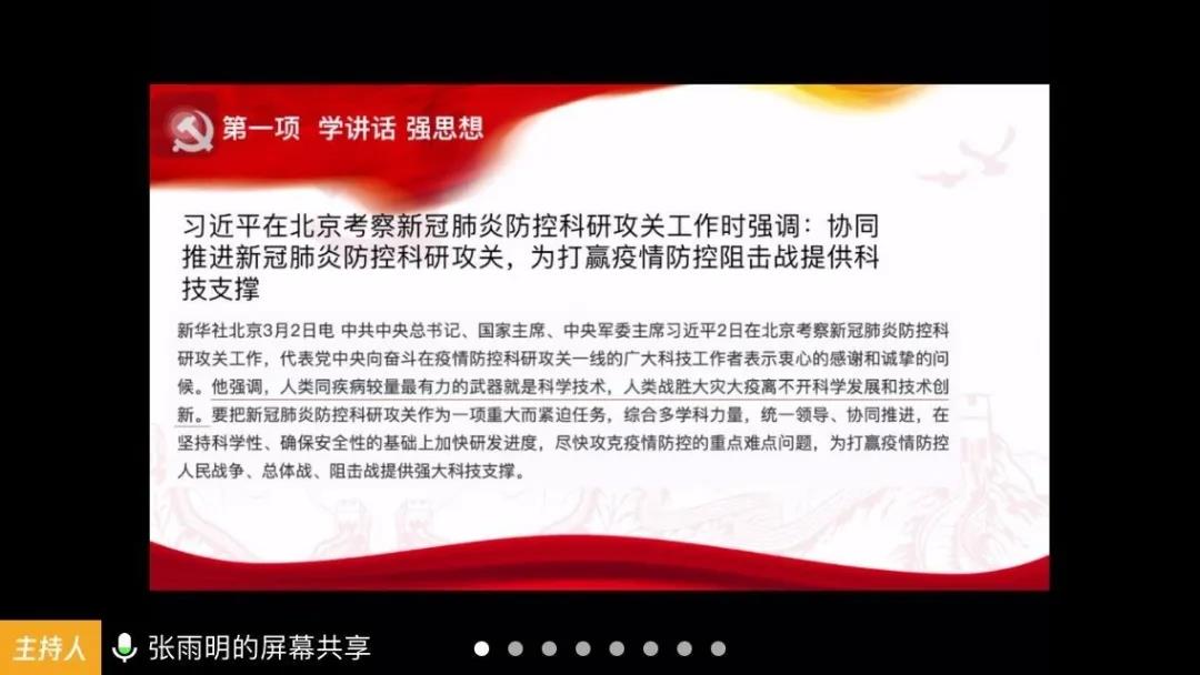 此次党支部线上视频会议的召开,支部成员共同学习了习近平总书记为防疫工作作出的重要指示,起到了凝心聚力、鼓舞士气的效果。同时要求大家时刻保持先进性,无论在提高自身还是防控疫情方面都要保持警惕,不松懈,不气馁,坚定疫情胜利的决心和信心。豆花视频