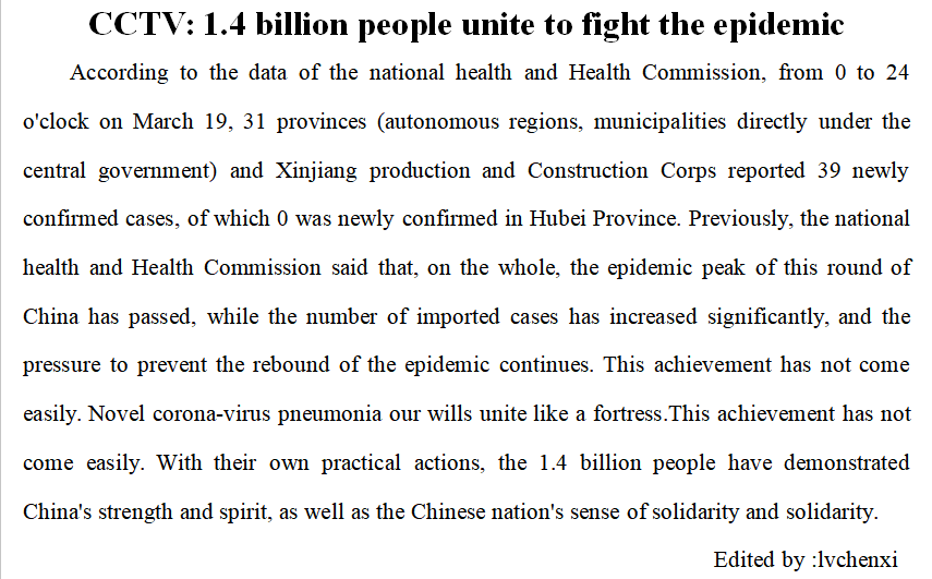 本次“共战疫情,我为祖国发声”活动开展以来,信控青年学子积极参与,踊跃投稿,共收到200余篇翻译文章。本次活动通过“抗疫翻译官”和“抗疫外交官”的方式让信控学子敢于为抗击新冠疫情发声,揭露污蔑抹黑、造谣生事的一些言行。同时也锻炼了大家英语翻译和写作能力,以此来激发大家对于英语学习的热情,丰富疫情防控期间的课业生活,现将部分优秀作品展示如下: