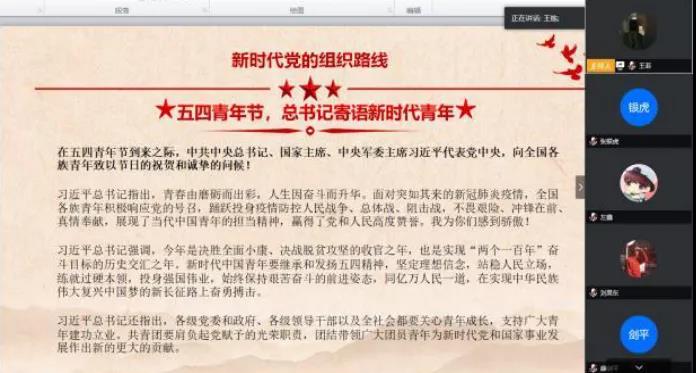 本科生第四党支部书记王栋带领大家学习五四青年节习近平总书记对新时代青年的寄语。他希望大家以习近平新时代中国特色社会主义思想为指导,深入学习领会习近平总书记重要讲话重要指示的核心要义,同时也要明白新时代青年有着属于自己的责任与担当,所以需要大家更加努力奋斗,为中国的美好未来贡献属于自己的一份力量!