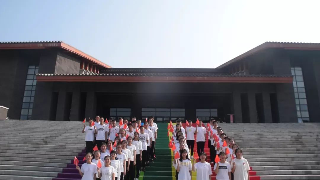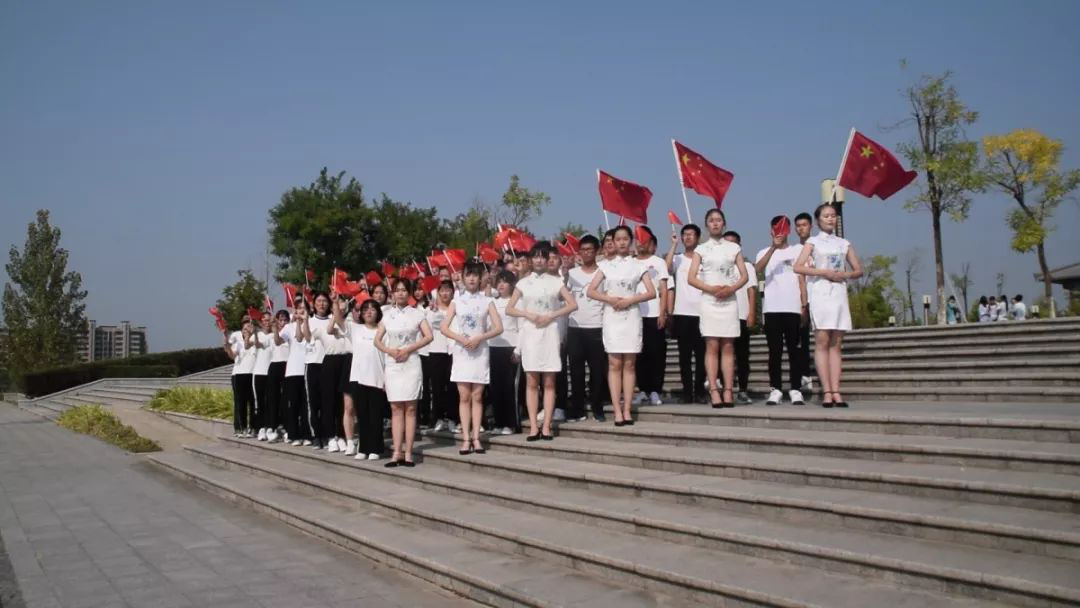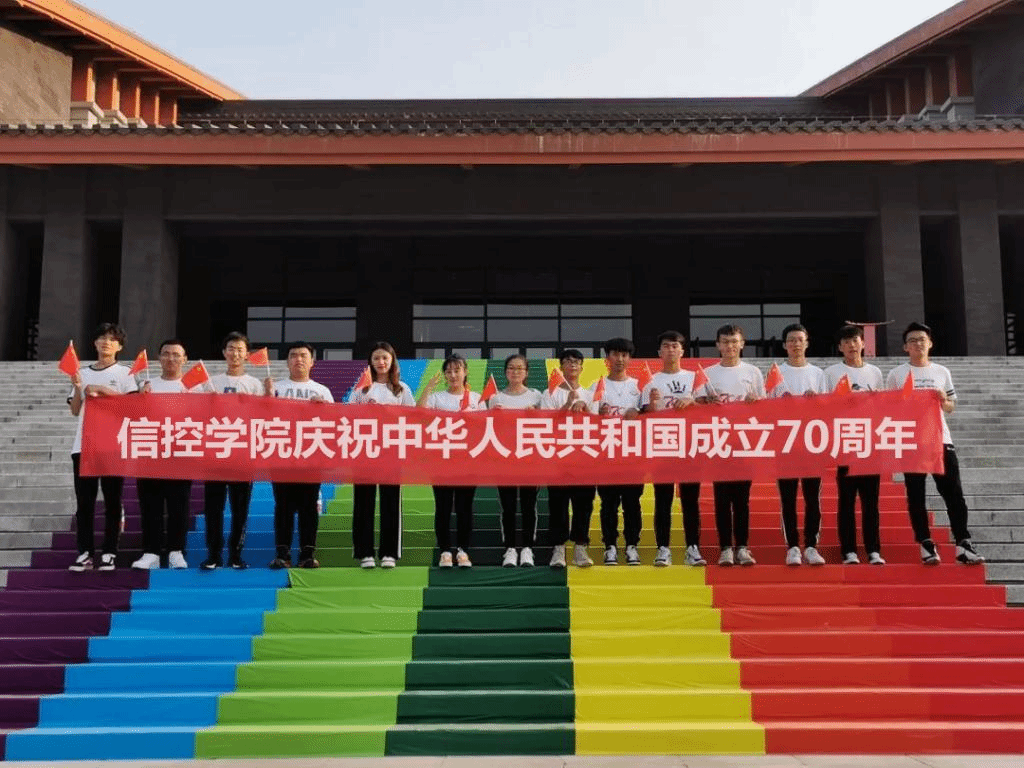 紫阁大礼堂前的彩阶象征祖国富饶山水,秀美景色,前路纷呈。新中国成立七十周年之际,同学们手持小国旗,脸贴爱国心纷纷表白祖国,“三十功名尘与土,八千里路云和月”字字贴心,句句传神。