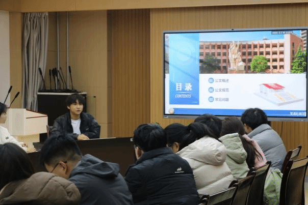 学生会秘书处负责人王洋从公文的特点与作用、种类、格式以及规范四个方面展开讲解,将理论与实操相结合,通过具体案例,深入浅出地剖析了学生干部在文字写作中的常见错误与改进方法,使同学们对文字写作的规范性有了更加直观、深刻的理解。