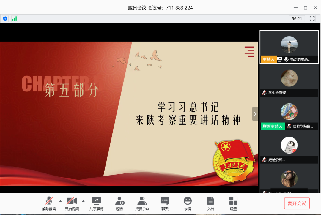 新媒体工作部部长,中共预备党员李子璇就脱贫攻坚、卫生防疫、义务教育、复工复产、西迁精神几个角度深入解读习近平总书记来陕考察重要讲话和重要指示精神,并阐述了西迁精神的核心与意义。