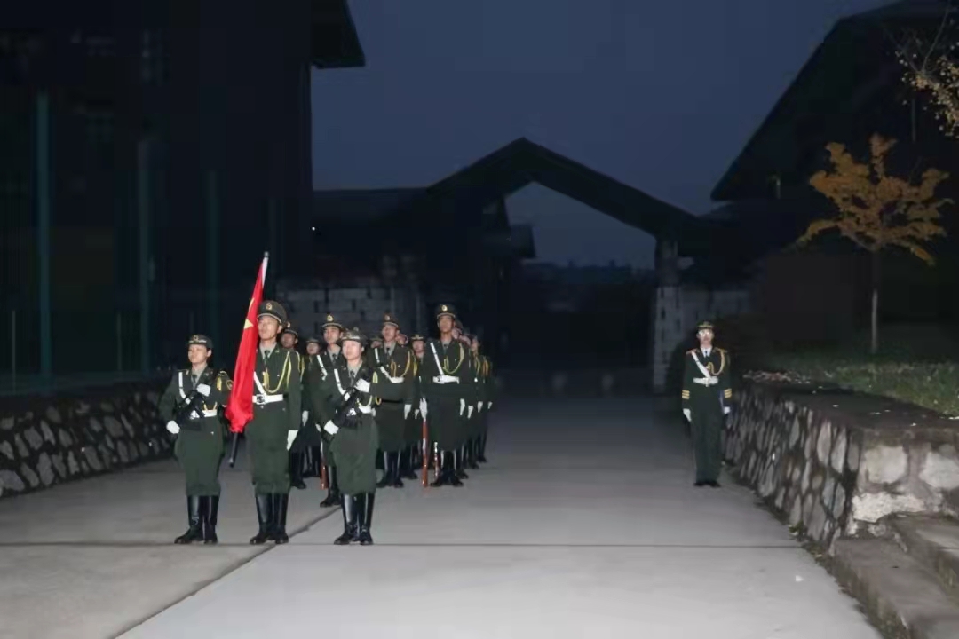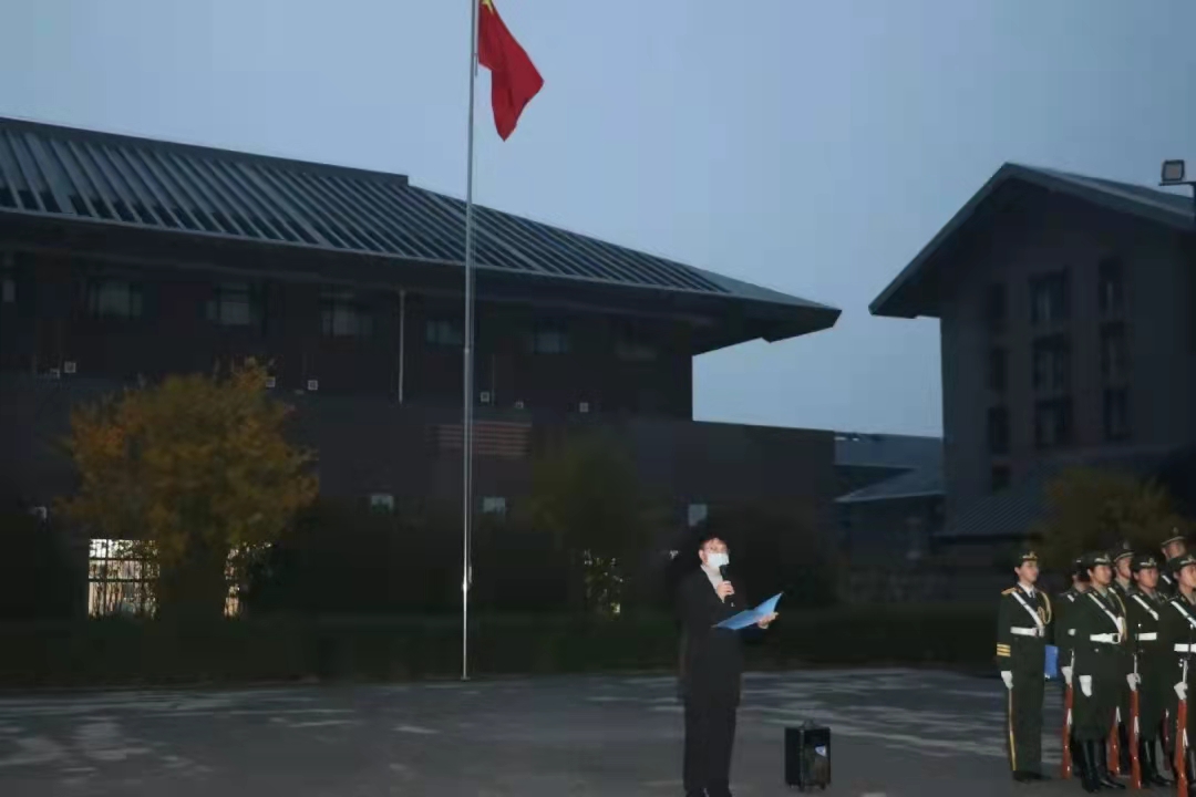 早上6:40,升旗仪式正式开始。身姿矫健的国旗护卫队护卫着鲜红的五星红旗入场。当庄严嘹亮的国歌响起时,五星红旗缓缓升起,所有参加人员唱着国歌,行注目礼,眼中饱含坚定与敬意。朝霞满天,红旗飘扬,震撼着在场每一颗爱国心。