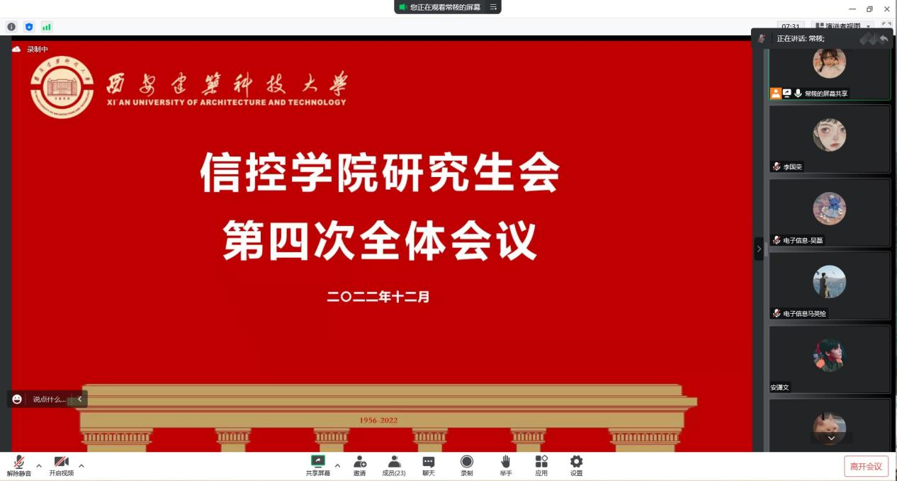 研究生会于线上召开了2022年秋季第四次全体会议。会议由主席团成员常筱同学主持,研究生会全体成员参加。