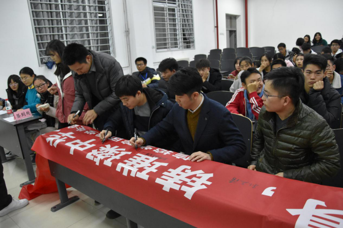 最后,张颉为大家作动员令。他向训练工作人员的辛勤付出和运动员们的刻苦训练表示感谢,随后强调了备赛和比赛的过程中要坚持“安全第一”的原则,鼓励在最后阶段,运动员要奋勇拼搏,工作人员要做好后勤保障,并预祝运动员们在比赛的过程中安全完赛、取得满意的成绩。大会最后,各位参会老师和同学纷纷在横幅上签字,以表决心。