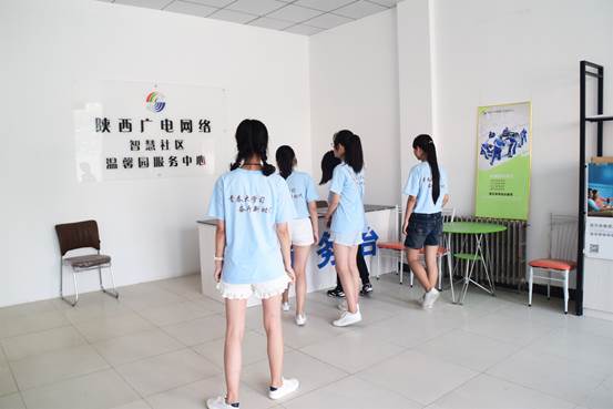 讨论过后,智慧社区负责人向实践队成员展示了陕西广电对该社区的智慧社区建设方案的预期构想,并带大家参观了该社区的智慧社区服务中心。最后同学们与温馨园社区智慧社区负责人的合影留念。