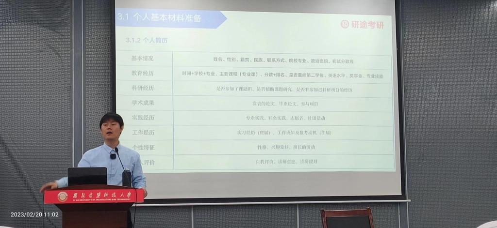 会上,王墨钊从考研复试流程、考研复试礼仪、考研指导老师选择等几方面进行指导。他首先对复试时间线、复试内容、复试流程等常识进行了介绍,着重强调关注院校最新复试通知,抓住各个时间窗口,熟悉目标院校考试大纲,掌握目标院校复试专业课,按照要求做好充分准备。其次,在复试礼仪方面,要注重仪容仪表,着装简单大方,具备学生气息,通过列举常见的不恰当行为让大家引以为戒。最后,在研究生学业规划方面,他列举了几点常见的学习科研问题,分析各类方向适合的学生类型,建议大家从自身需求、发展规划出发,制定适合自己的学业规划,并且积极主动联系导师。