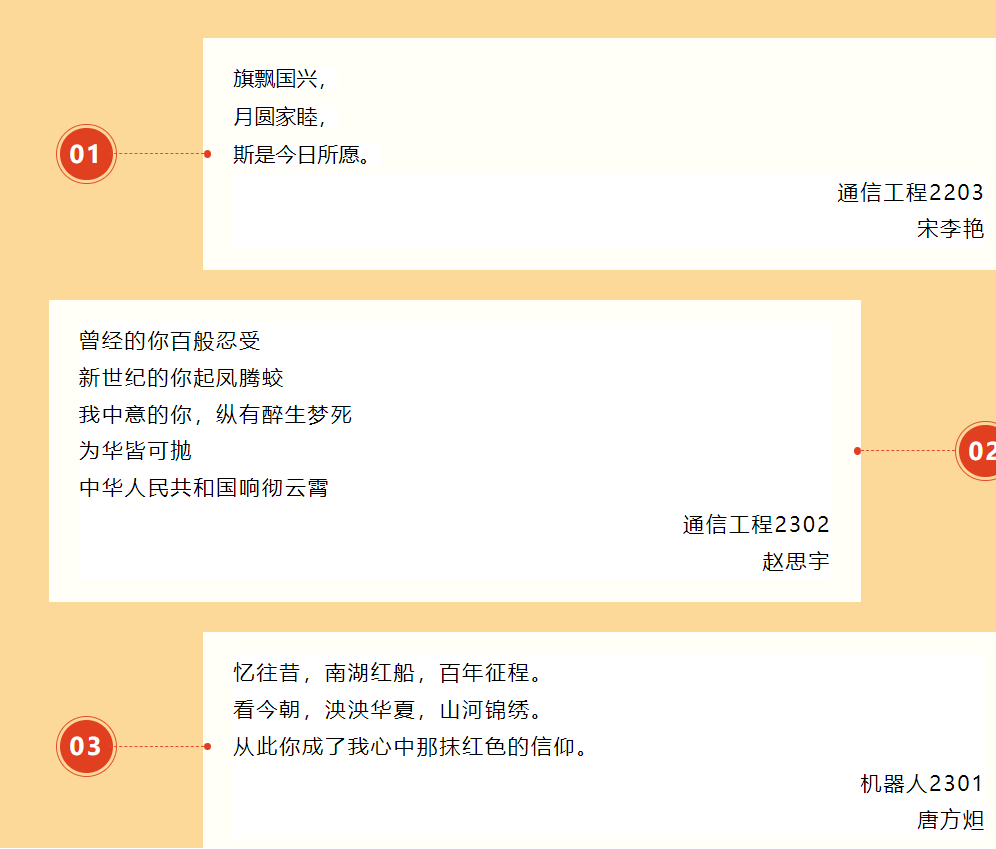 在这个举国同庆的日子里,信控学子积极参加“青春献礼中国梦”主题系列活动,为祖国送上了最诚挚的祝福!让我们一起来看看吧!同时,信控学子积极参加 “青春献礼中国梦”主题系列活动,以情诗的形式书写对祖国深沉又热烈的爱。让我们一同诵读!