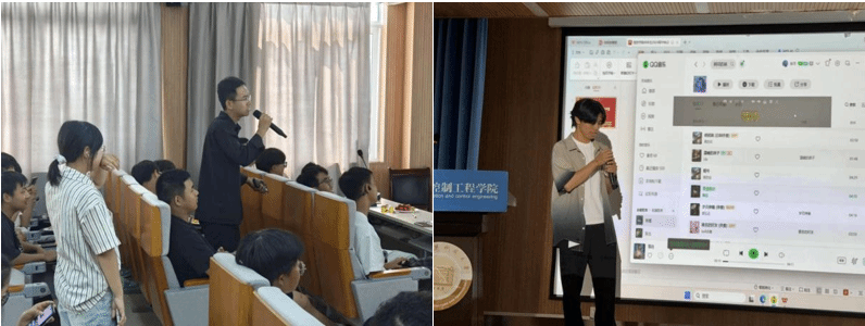 茶话会中的击鼓传花游戏更是精彩非凡。音乐响起,众人迅速传递扇子,现场气氛活跃,大家踊跃参与其中。信控学子果然深藏不露,幸运观众上台献唱,《你在,不在》《心语》《此去半生》几首歌曲一经唱响,便瞬间点燃全场氛围,引得许多同学自愿上台一展歌喉。《不染》《少年游》《青花》等歌曲再次唱响全场,余音袅袅。