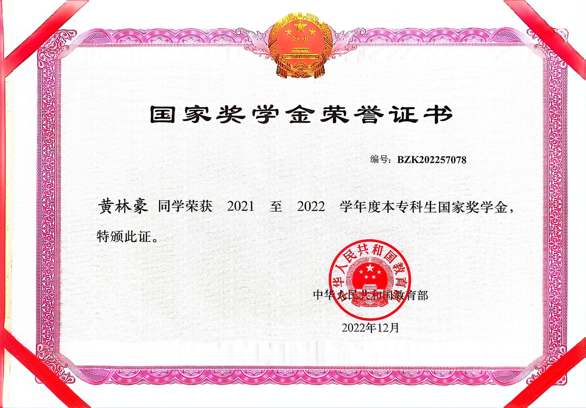 计算机科学与技术2020级本科生,2020年入学起,面对计算机专业这门十分重视理论与实践结合的工科专业,面对陌生的专业知识、晦涩的编程代码,黄林豪坚信“世上无难事,只怕有心人”。课本一遍一遍学,代码一行一行敲。经过坚持不懈的努力拼搏,终于啃下了专业学习中的一个个“硬骨头”。黄林豪本科连续三年获得校优秀学生一等奖,荣获国家奖学金,并以375分的好成绩成功考研至北京工业大学。