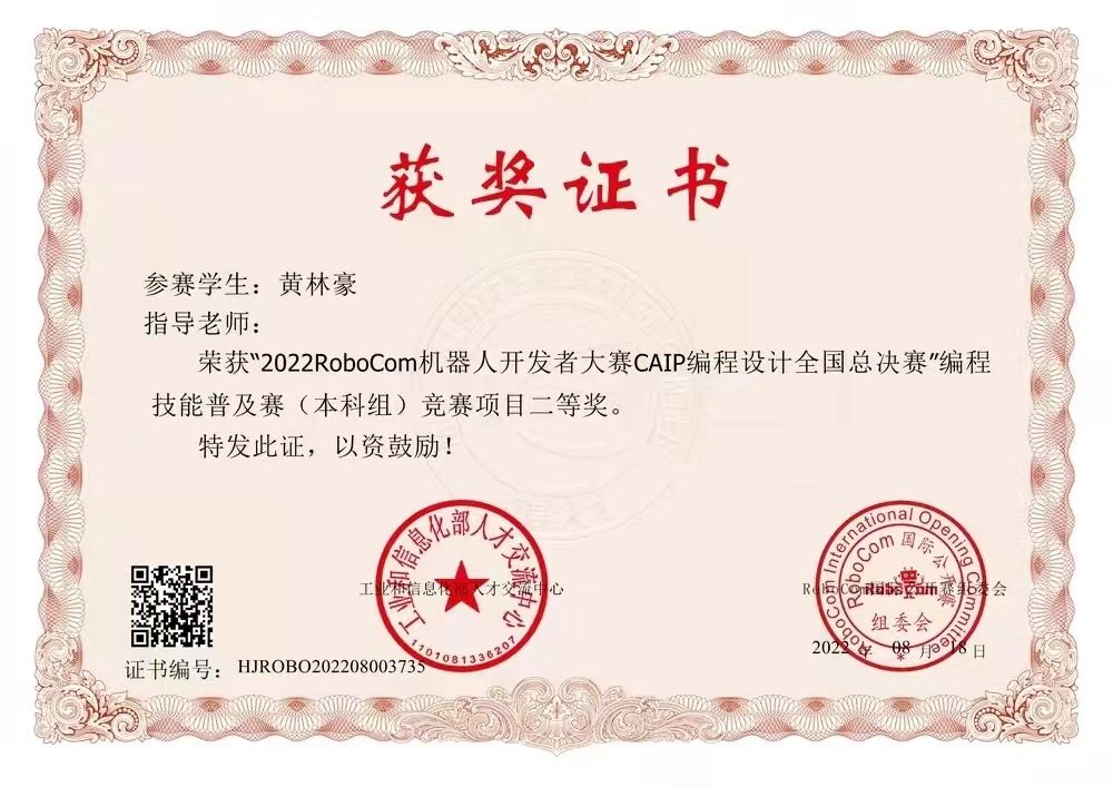 3、2022年RoboCom机器人开发者大赛全国二等奖;