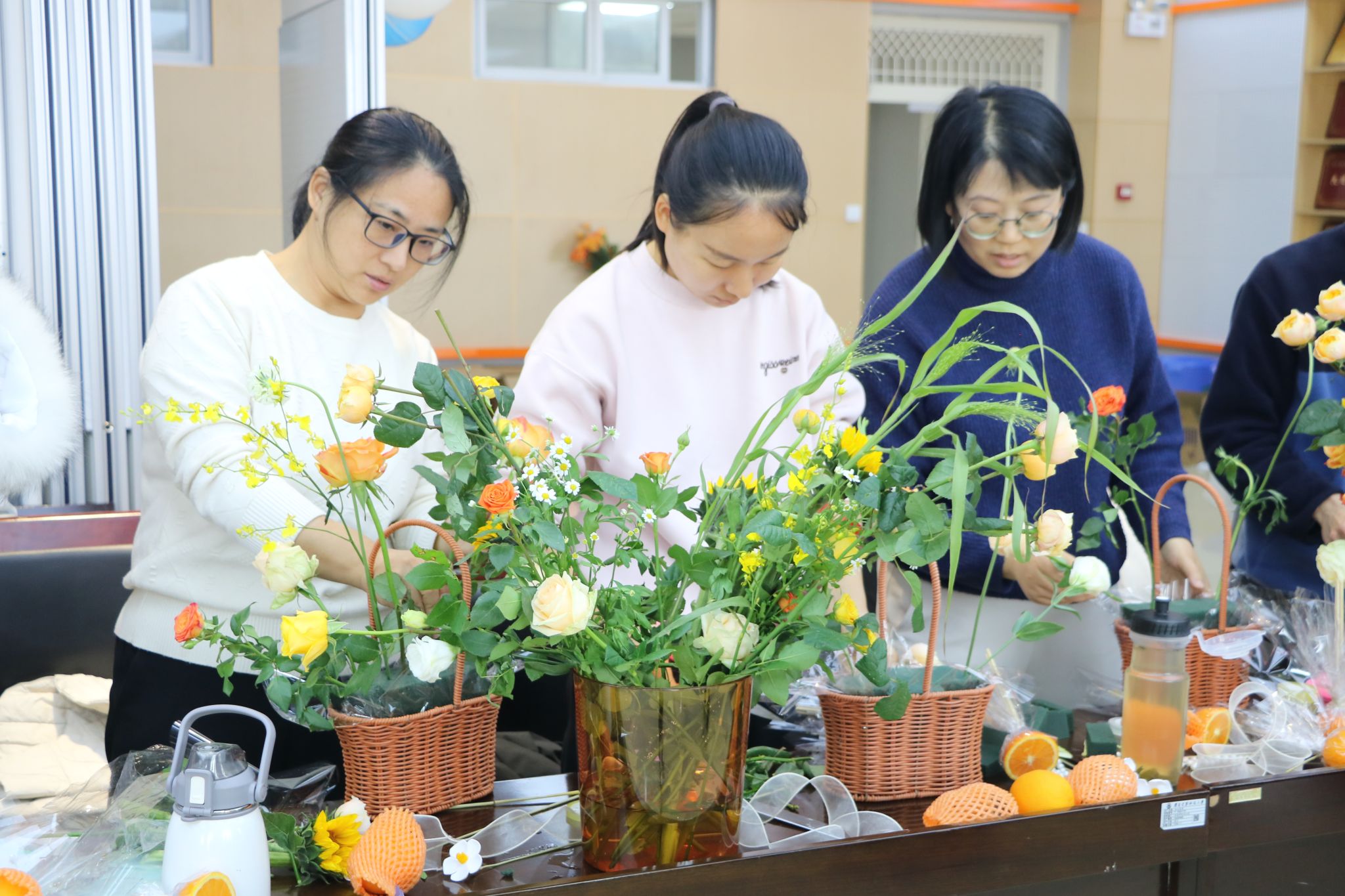 活动现场花香四溢,玫瑰、洋桔梗、向日葵、康乃馨、雪柳等各色花材与精美花器整齐摆放,温馨雅致的氛围扑面而来。崔璐结合冬季花卉的特点,从花材选择、色彩搭配、构图技巧等方面进行了详细讲解。她通过生动的演示,现场演示了修剪花枝、固定花材、层次搭配的技巧,深入浅出的讲解让老师们迅速掌握插花的基本要领。