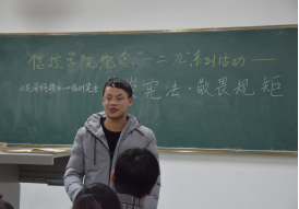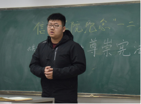 12月4日为国家宪法日,习近平总书记强调,要以设立国家宪法日为契机,深入开展宪法宣传教育,大力弘扬宪法精神。会议围绕宪法有关内容展开,旨在为学院全体师生做好宪法宣传教育。张雨明首先为成员们普及宪法基本知识,他提到:宪法是国家的根本大法,是治国安邦的总章程。我们要完善以宪法为核心的中国特色社会主义,任何组织或个人都不得有超越宪法和法律的特权,同时我们也要成为宪法的忠实崇尚者、自觉遵守者、坚定捍卫者。他结合同学们的生活实际,向大家讲述了宪法精神。每个人都要认清自己的身份,做自己该做的事。作为学生,要做到遵守校纪校规、学术诚信;作为宣传工作者,要规范自身言行,对自己和他人负责,通过运用传媒宣传带动更多人学法、普法、敬法。