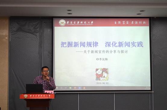在简单的介绍后,李友海带领大家步入以“把握新闻规律,深化新闻实践”为主题的培训内容。首先,他讲了新闻业务的核心:“人”,从“党和国家领导人对宣传工作的指示和要求”到“新闻实践要‘以人为本’”,从“南方周末”到西安建大报,他分别用不同的例子讲解了在宣传过程中,不管是新闻人还是大众,都讲究以人为本。