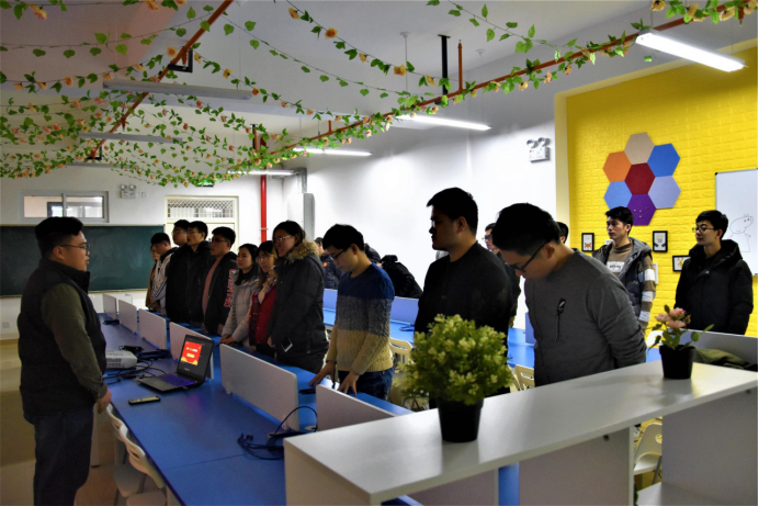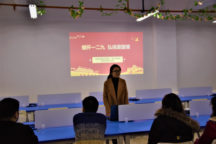 活动开始,杜瑶同学作为主持人代表全体研究生发言重温了一二·九的历史背景,1935年12月9日,北平(北京)大中学生数千人举行了抗日救国示威游行,反对华北自治,反抗日本帝国主义,要求保全中国领土的完整,掀起全国抗日救国新高潮。发言结束,全体成员起立为当年抗战牺牲的烈士默哀一分钟。