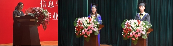教师代表通电系王燕妮为2021届毕业生送上期许与嘱托,希望2021届毕业生未来多一点努力,守护最初的梦想;多一份坚持,抗住人生的压力;多一些自信,归来仍是少年。研究生代表温倩和本科生代表杨紫豪从“回忆、感恩、坚定”谈到大学的点滴生活,并表示未来继续秉承着豆花视频