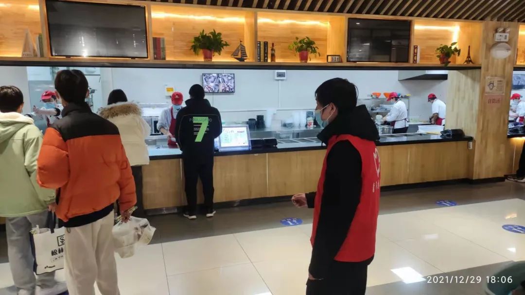 第二党支部于每次饭点安排人维持食堂秩序。在每个队伍后都安排一个志愿者,让大家能够井然有序的排队,确保每个同学都能买到饭,吃到饭。