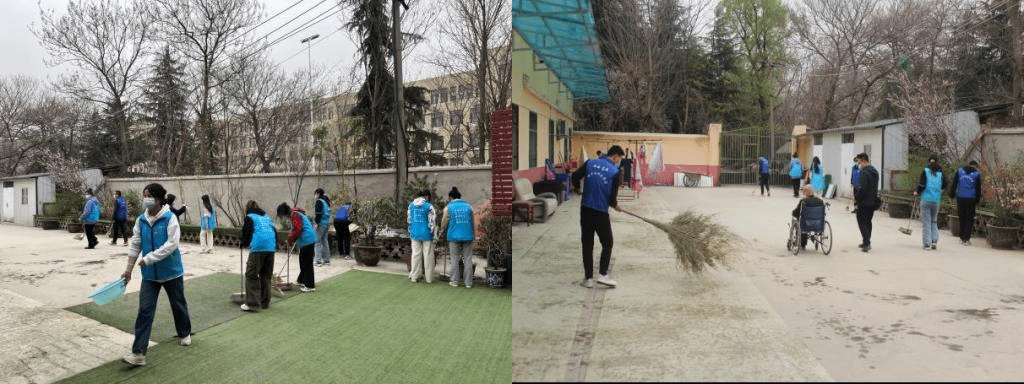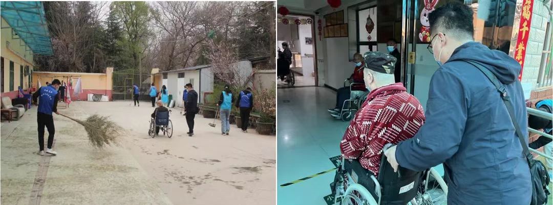 志愿者身着蓝色马甲在敬老院开展志愿服务,老人们非常开心,纷纷从房间里走了出来,坐轮椅的老人也让工作人员把他们推了出来,志愿者们与老人们亲切打招呼,拿着抹布、笤帚、簸箕等工具,仔细擦洗清扫房间内外、院落的墙壁、地面、卫生死角及各类设施;用手搀扶着老人一起散步,聊天拉家常,听老人讲述丰富的人生阅历;拿出携带的手提袋、口罩等小礼品,向老人们分发,大家分工合作,热情高涨。