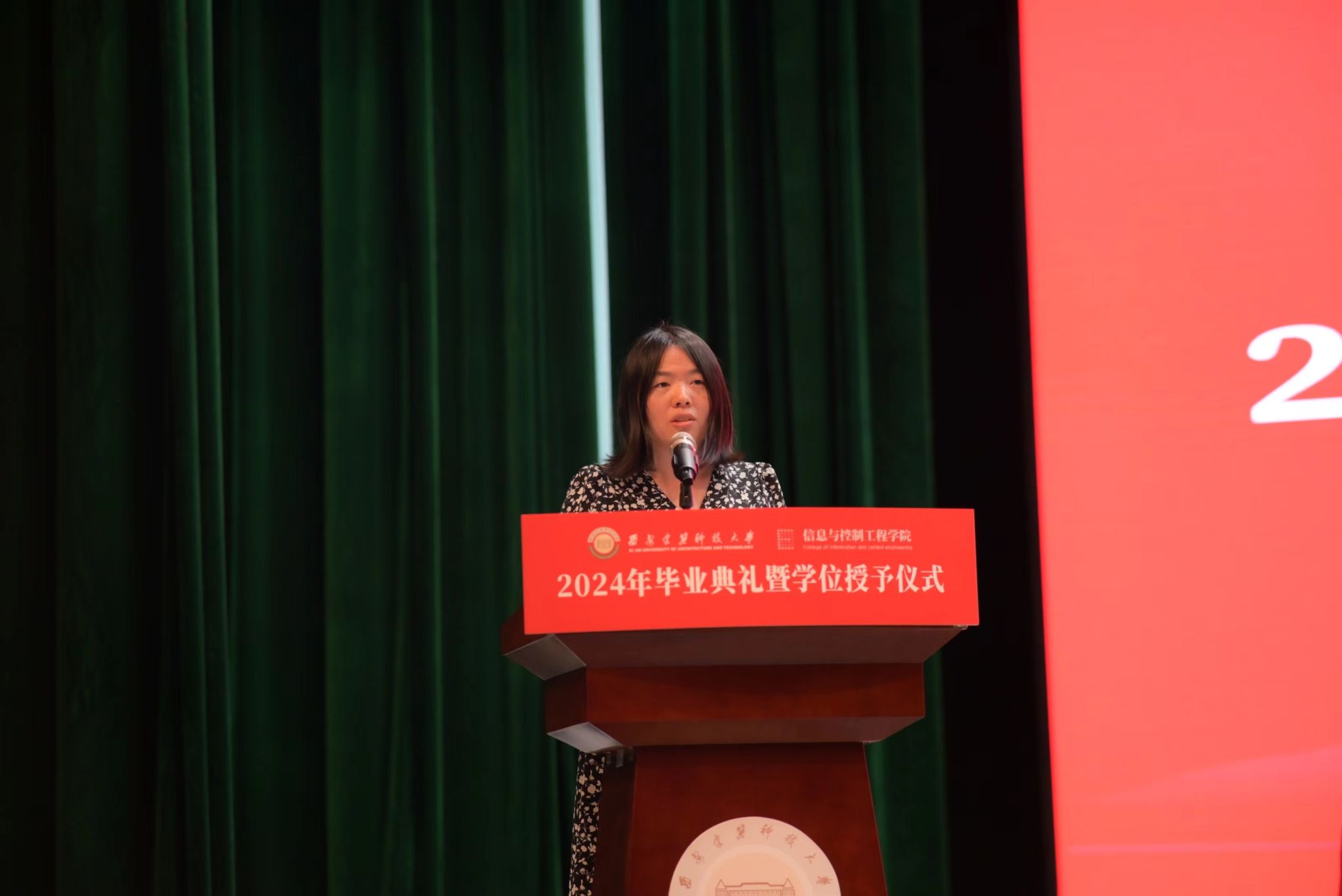 教师代表王艳对毕业生表示真挚的祝福,希望全体毕业生们目有山川、胸有沟壑、心有明灯,坚定地审视自己的初心和理想,持之以恒为之奋斗,不断追求更高更远的目标,创造出更加辉煌的人生。