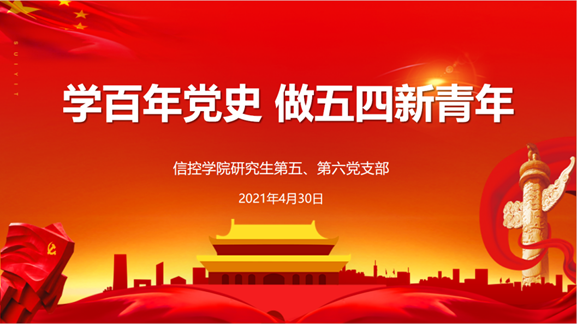 研究生第五、第六党支部于2021年4月30日下午在信控大楼504开展“学百年党史,做五四新青年”主题党日活动,重温爱国青年的足迹,以此缅怀五四先驱崇高的爱国情怀,赓续共产党人精神血脉。