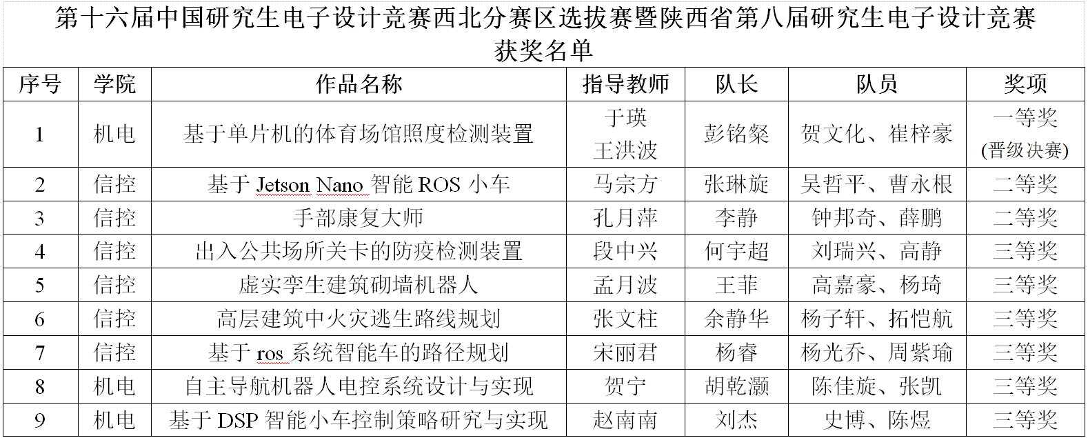 2021年7月3日至7月4日,第十六届中国研究生电子设计竞赛西北分赛区选拔赛暨陕西省第八届研究生电子设计竞赛于西北工业大学长安校区举行。在为期两天的比赛中,我校参赛的10支队伍,经过现场作品展示、答辩、专家评审等环节,最终获得一等奖1项(晋级全国总决赛)、二等奖2项、三等奖6项。机电学院于瑛老师荣获“优秀指导教师奖”。