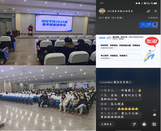 于学府城6栋301召开毕业生就业动员会。大会特邀请新东方前途出国李晓琛和2021级研究生王志富。2020级本科生辅导员赵莎、李朝,全体2024届本科毕业生参加此次大会,会议面向学生家长全程直播。